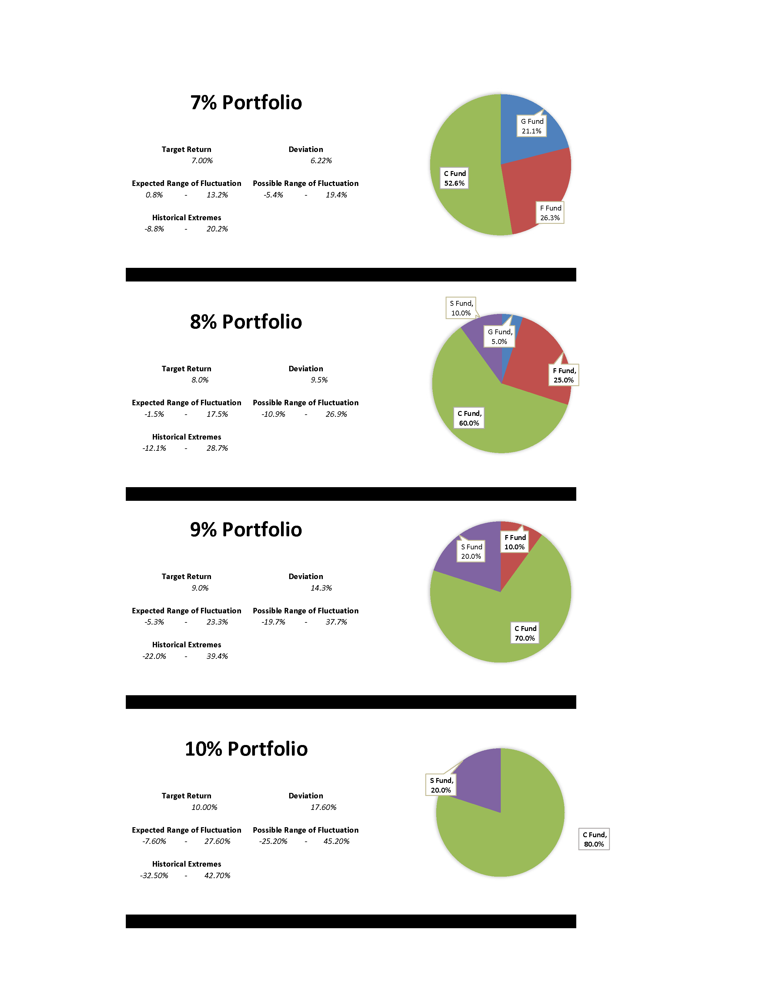 See this month’s portfolios. DON’T JUST LOOK AT RATE OF RETURN. Always view the target return of each portfolio in context of its ranges of fluctuation.