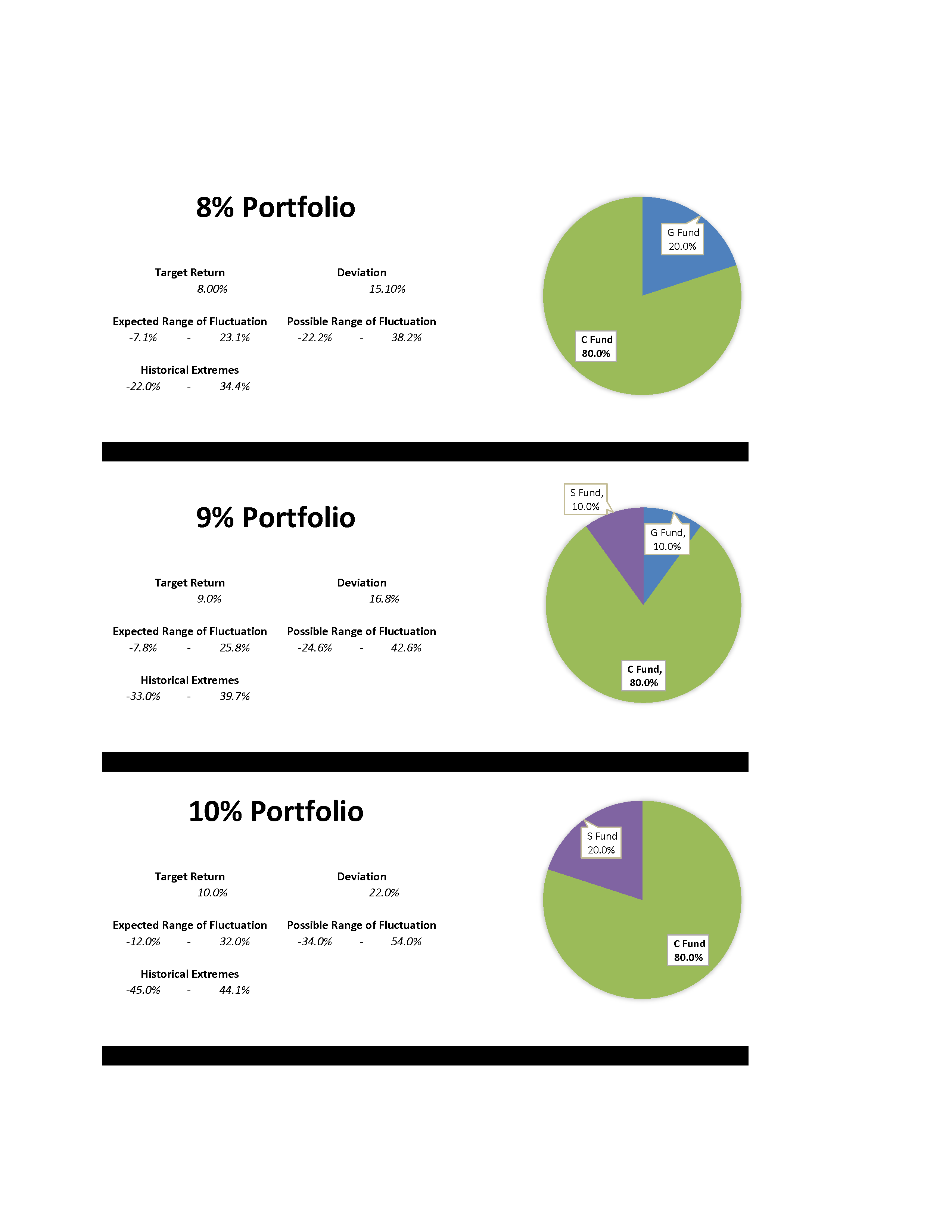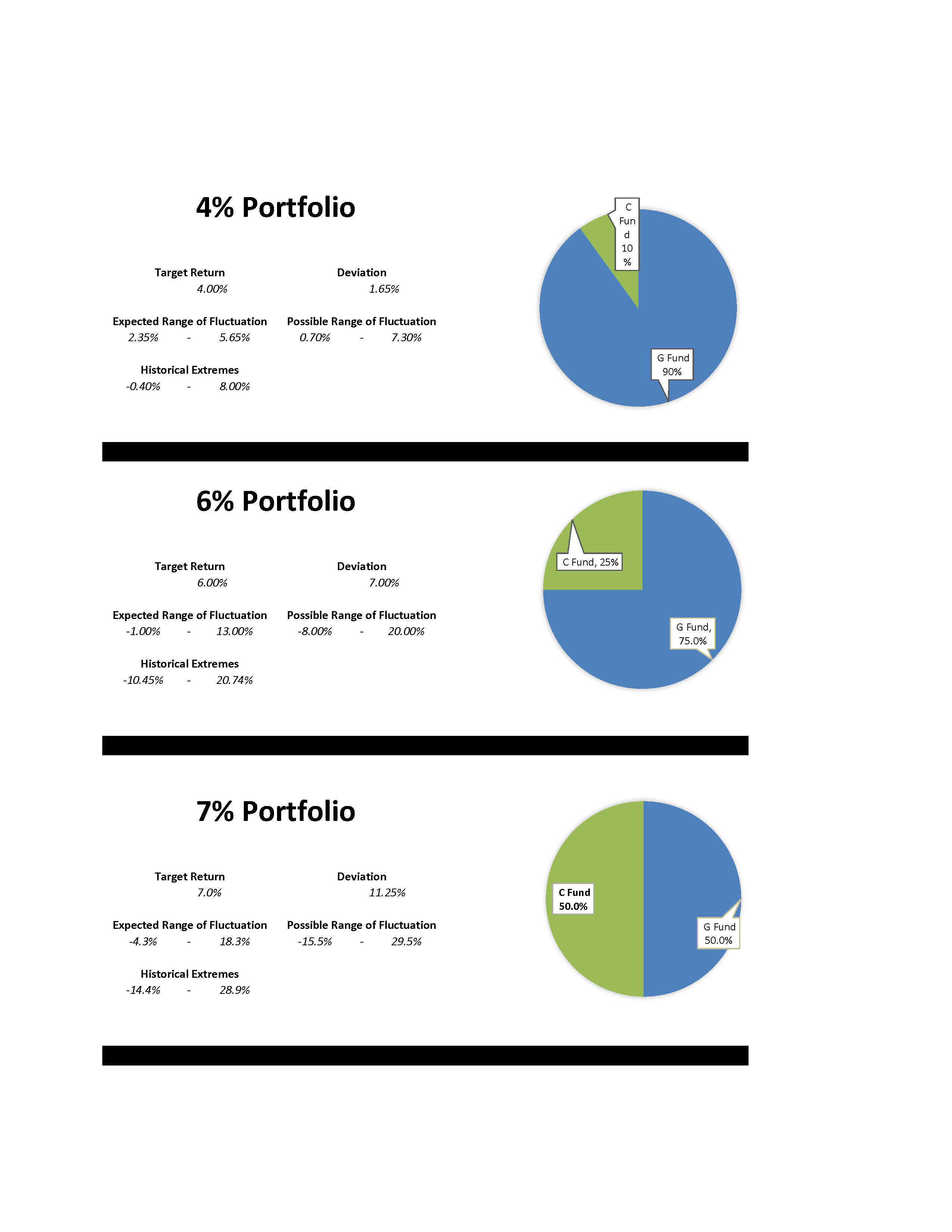 See this month’s recommended portfolios.  DON’T JUST LOOK AT RATE OF RETURN. Always view the target return of each portfolio in context of its ranges of fluctuation.